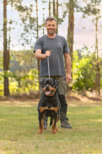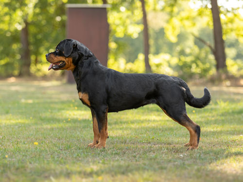 Groß, mit kräftigen Knochen, kräftiger Kopf mit sehr gutem Stop, breiter Fang, dunkelbraune Augen (2a), mittelgroße und korrekt angesetzte und getragene Ohren, Lefzen und Zahnleiste dunkel, kräftiger Hals, tiefe breite Brust mit sehr guter Vorbrust, Vorhand gerade, kräftige sehr gut aufgeknöchelte Pfoten, gerader Rücken, kräftige Hinterhand richtig gestellt und gewinkelt, korrekte Kruppe, korrektes Stockhaar mit rotbraunen Abzeichen klar abgegrenzt, Rute hängend getragen, raumgreifendes Gangwerk, vollständiges Scherengebiss